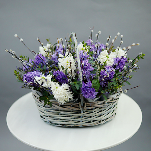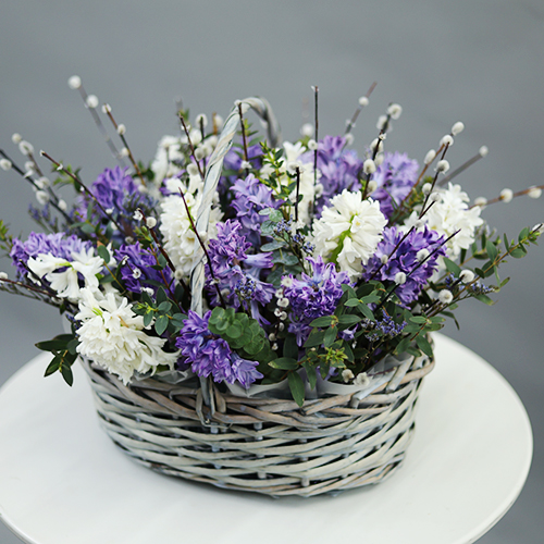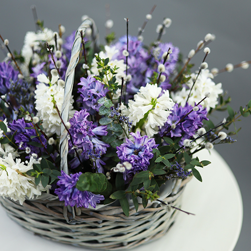 Композиция в корзине "Ирэн" из гиацинтов и вербы