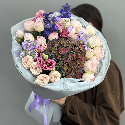 Букет "Бергамот" из Голландской гортензии, кустовых пионовидных роз Мэнсфилд парк, ароматных маттиол, дельфиниума и эустом
