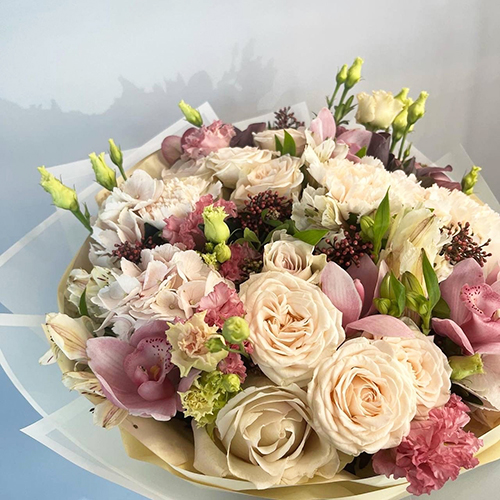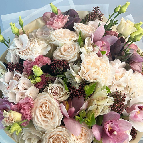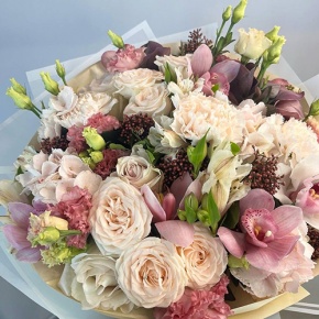 Букет "Розовый жемчуг" из кустовых роз, орхидей и эустом